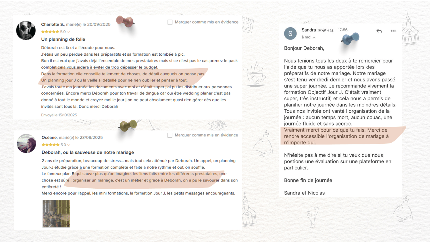 HonnĂȘtement, plusieurs semaines. C'est pour ça que ce n'est pas "juste une feuille d'horaires". Chaque Ă©tape demande du temps de rĂ©flexion, d'analyse, de prise de dĂ©cision. Mais avec mon accompagnement, tu avances Ă ton rythme sans jamais te sentir bloquĂ©e. L'idĂ©al c'est de commencer 6-3 mois avant ton mariage.